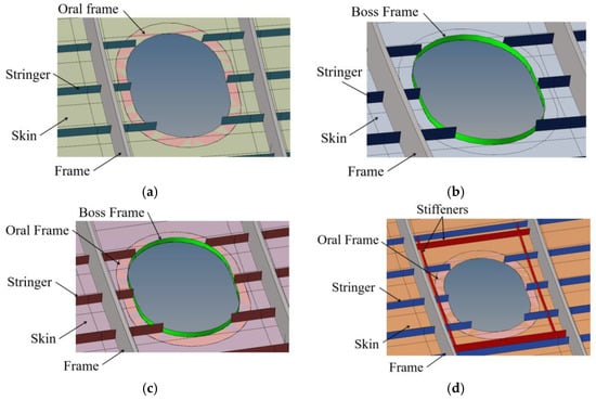 Illustrations of opening reinforcement configurations for different PRSEUS panel schemes. (a) Scheme A mouth reinforcement. (b) Scheme B boss reinforcement. (c) Scheme C and Scheme E mouth and boss reinforcement. (d) Scheme D frame and mouth reinforcement.