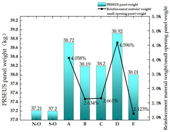 The structural weight changes of the PRSEUS panel without an opening and the small-opening panels after reinforcement are compared and analyzed, as depicted in Figure 13. Scheme B, Scheme C, and Scheme E show a smaller weight increase, while Scheme D results in the most significant weight gain. The reinforcing structure for the small opening has a minimal impact on the weight change of the panel structure.