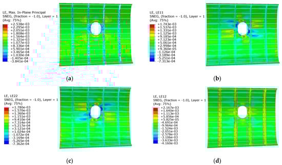 Stress and strain cloud diagrams are shown in Figure 14 and Figure 15. The frame in the structure changes the transfer of load force, making the structure of the stress distribution more uniform; due to the frame, the stiffness is too great, resulting in the shear phenomenon. The frame at the shear stress is higher, so the panel produces compressive stress. Due to the design of the openings, the concentration of stress in the PRSEUS panel appears in the vicinity of the openings. The strain cloud is similar to the stress cloud, and it also proves the reliability of the simulation results.