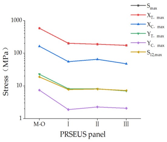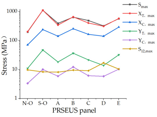 Because the ultimate load is in the same order of magnitude as the general loading condition, it is sufficient to analyze the simulation results of the open wall plate for only one loading condition. In this paper, we analyze the stress changes in a small-opening PRSEUS panel under general tensile conditions.