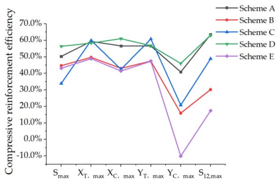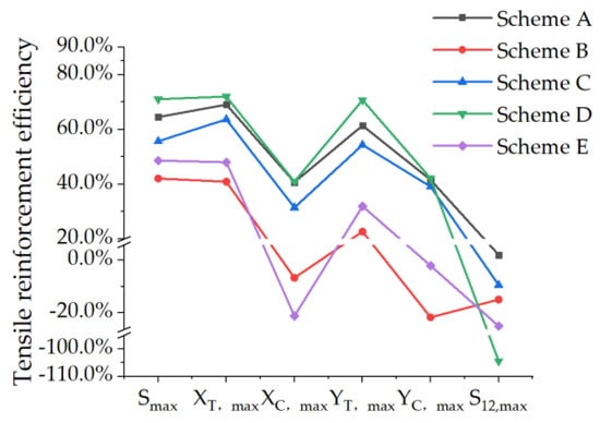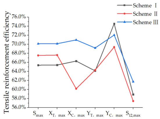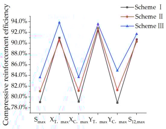 The stress of the non-opening PRSEUS panel, the small-opening panel, and the reinforced panels under tensile load conditions are compared and analyzed, as shown in Table 8 and Figure 16. The tension reinforcement efficiency (the reinforcement efficiency under tensile loading conditions) of each scheme is displayed in Table 9 and Figure 17.