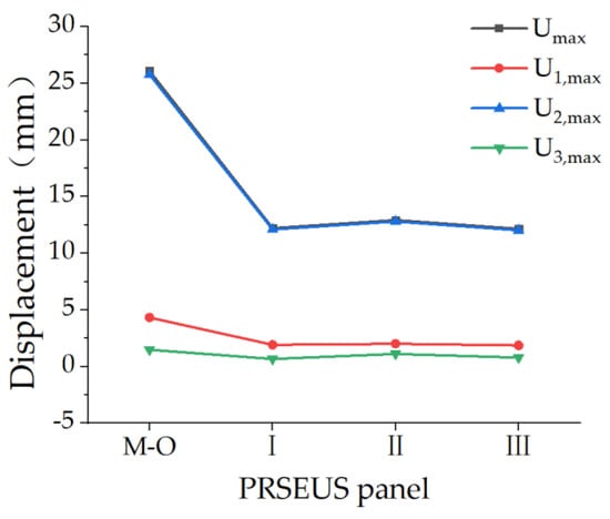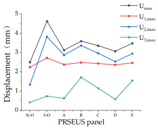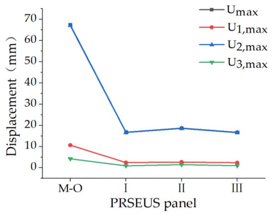 Compared to the unreinforced mid-sized-opening PRSEUS panel, the three schemes significantly affect the panel’s displacement, with displacement-reduction efficiencies above 50%. The displacement-reduction efficiency of Scheme III in the X and Y directions is the highest at 56.79% and 53.34%, respectively. The reinforcement efficiency of Scheme I in the Z direction is the highest at 54.65%. Scheme I and Scheme III have a more significant effect on displacement reduction than Scheme II, with Scheme III having the highest displacement-reduction efficiency of 53.41%.