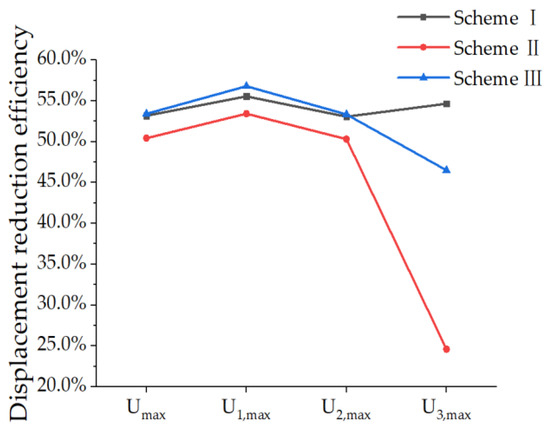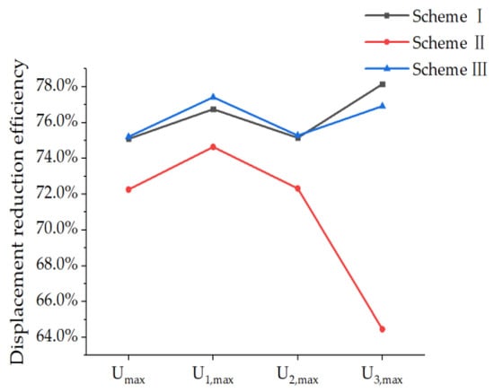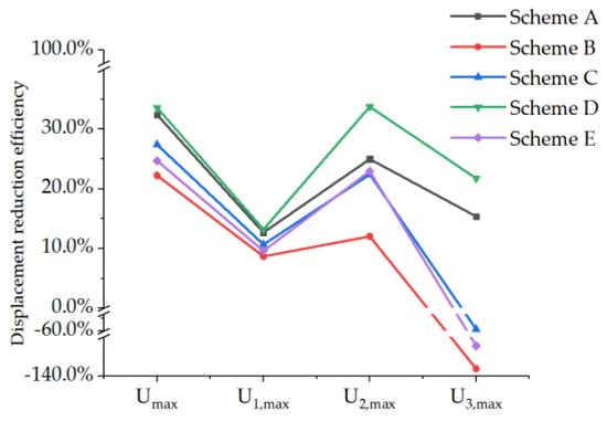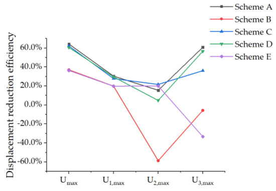 The displacement change of the reinforced PRSEUS panel under tensile load conditions is compared and analyzed in Table 19 and Figure 31, and the displacement-reduction efficiency of the reinforced scheme is shown in Table 20 and Figure 32.