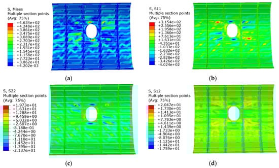Stress cloud of Scheme A’s structure under tensile loading conditions. (a) von Mises stress. (b) Longitudinal stress. (c) Transverse stress. (d) In-plane shear stress. Notes: S11 is the structural longitudinal stress cloud, S22 is the structural transverse stress cloud, and S12 is the structural in-plane shear stress cloud.