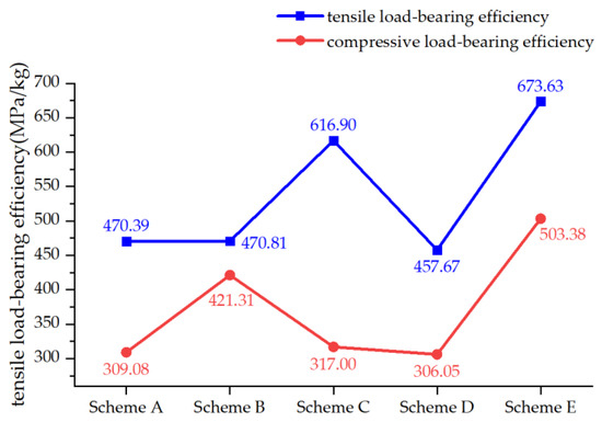 In this section, the load-bearing efficiency of the reinforced scheme for the mid-sized-opening panel is compared and analyzed, as shown in Figure 37. From the diagram, it is evident that the load-bearing efficiency of the reinforced panel under a tensile load is higher than under a compressive load. Scheme III exhibits the highest load-bearing efficiency under both tensile and compressive load conditions at 20.74 MPa/kg and 50.66 MPa/kg, respectively.