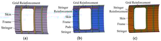 PRSEUS panel mesh model. (a) Grid model of unopened panel. (b) Grid model of small-opening panel. (c) Grid model of mid-sized-opening panel.