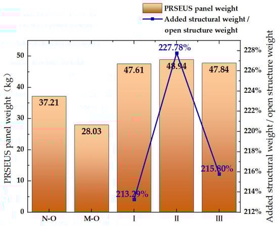 Weight variation of PRSEUS panels. Note: N-O denotes a non-opening PRSEUS panel, S-O denotes a small-opening PRSEUS panel, and A–E denotes small-opening-reinforcement Scheme A–E.
