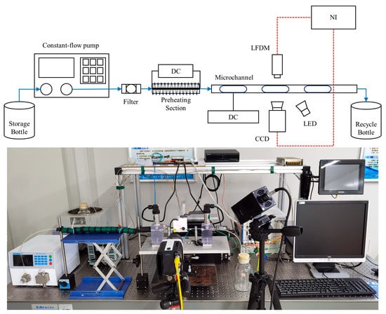 The experimental system was set up to observe the flow pattern and predict heat transfer performance, as shown in Figure 1. The working fluid was driven by a micropump (2 PB-0240, Beijing Xingda Science & Technology Development Co., Ltd., Beijing, China) from the receiver through a 7 μm filter to the preheating section. The working fluid reached its saturation temperature at the preheating outlet through electric power heating. The saturated working fluid flowed through the test section, where it was recorded by a high-speed camera (Phantom R310, Vision Research, Inc., Wayne, NJ, USA) and measured by a laser confocal displacement meter (LT9011 M, Keyence Corp., Osaka, Japan) at 70 mm from the inlet. The high-speed camera captured at 1000 fps with a resolution of 768 × 480 pixels and an exposure time of 480 μs. The laser confocal displacement meter (LFDM) has a response time of 0.64 ms, a laser spot diameter of 2 μm, and a measurement range of ±0.3 mm.
