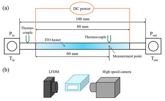 The test section, made of quartz glass (Chengteng Equipment Co., Ltd., Beijing, China), had an ITO film deposited on it to supply uniform heat flux, as shown in Figure 2. The test section was 100 mm long and oriented horizontally, with a heated length of 80 mm. The inner dimensions of the rectangular microchannel in the test section were 0.3 × 0.8 mm2, and the inner dimensions of the square microchannel were 0.7 × 0.7 mm2. Water and ethanol were used as working fluids, with mass flux ranging from 0.25 to 290.89 kg/m2·s.