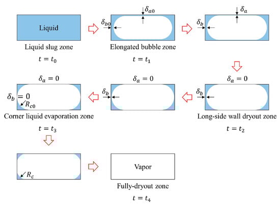 Firstly, the heat flux is uniform and does not vary over time. Secondly, all the heat flux is utilized for evaporation. Thirdly, the working fluid is considered to be saturated from the nucleation point. Fourthly, bubbles are assumed to be in a saturated state, with a constant pressure drop and unchanged physical properties. Fifthly, the liquid film decreases linearly along the axial direction. Sixthly, the liquid film thickness is very small relative to the microchannel dimensions. Then, evaporation arises only at the vapor–liquid interface, and the thermal inertia of the microchannel wall is neglected. Eighthly, the bubble in the elongated bubble zone and long-side wall dryout zone is considered to be a rounded rectangle shape. In the corner liquid evaporation zone, liquid accumulates in the four corners, each forming a quarter-circle cross-section.