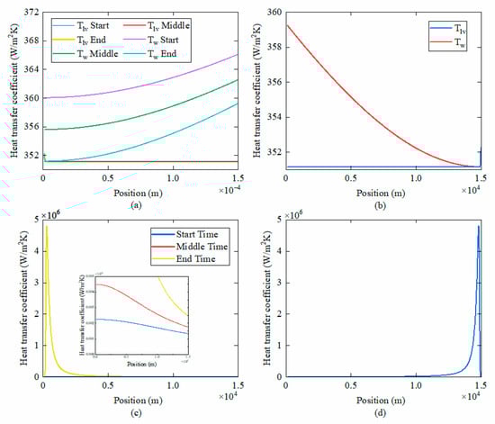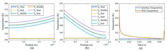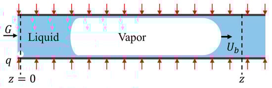 The flow boiling model is one-dimensional along the flow direction, as illustrated in Figure 5, and the liquid slug and the vapor slug alternately pass through the microchannel at the z = 0 cross-section. Due to wall heating, the liquid evaporates into vapor during the downstream movement, so the liquid slug shortens while the vapor slug lengthens. Since the vapor density is significantly lower than that of the liquid, the rate of liquid slug shortening is much lower than the rate of vapor slug lengthening. Therefore, the speed of movement of the liquid slug and vapor slug increases along the flow direction.
