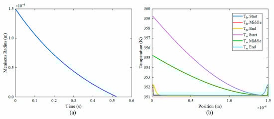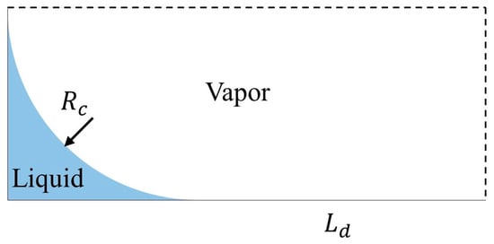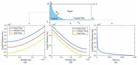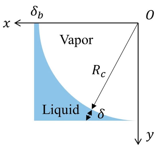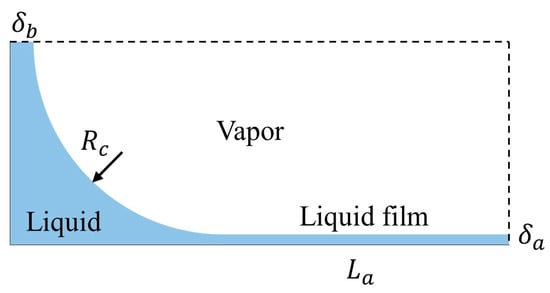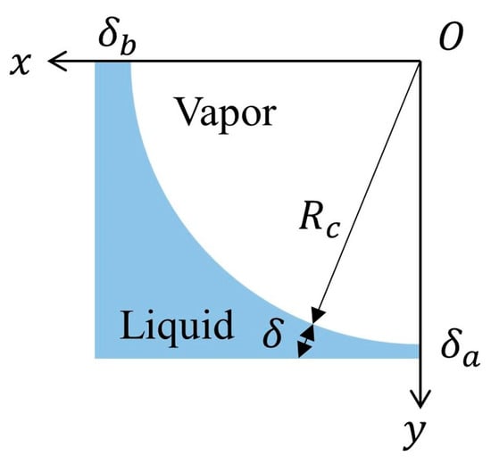 where δa0 and δa represent the initial film thickness and transient film thickness in the center of the long-side wall; δb0 and δb represent the initial film thickness and the transient film thickness in the center of the short-side wall. The curvature of the meniscus at the vapor–liquid interface is obtained from Kc = 1/Rc ≈ 2/H.