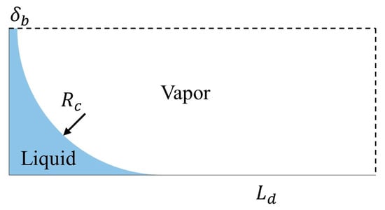 where δ’b0 represents the film thickness in the center of the short-side wall at the moment the long-side wall dries out. The curvature of the meniscus at the vapor–liquid interface can be calculated from Kc = 2/H.