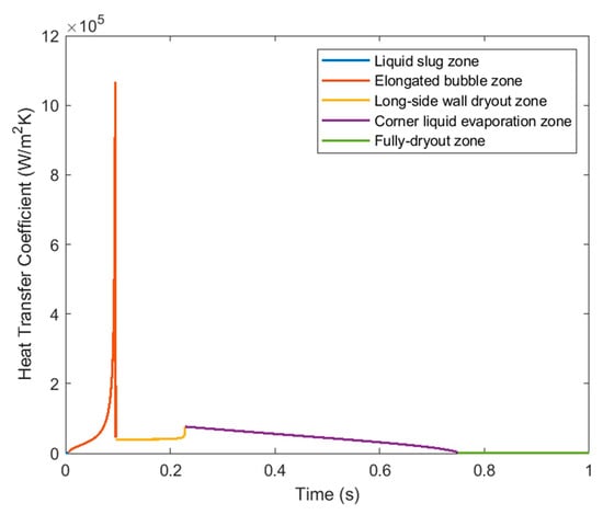 To predict the flow boiling heat transfer coefficient in rectangular microchannels, the heat transfer coefficients of five zones (the liquid slug zone, the elongated bubble zone, the long-side wall dryout zone, the corner liquid evaporation zone, and the full dryout zone) are analyzed in detail.