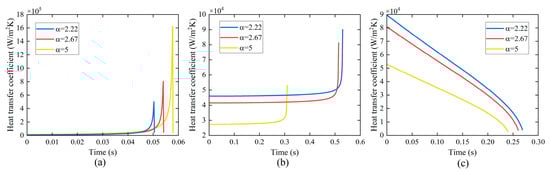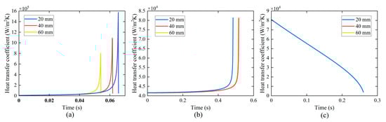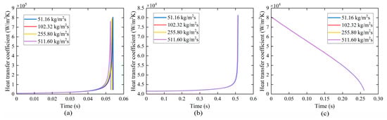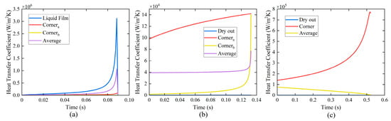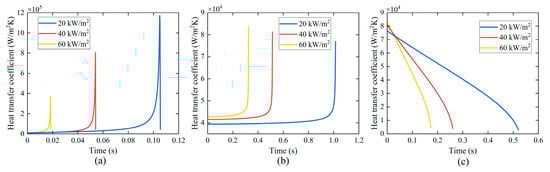 Variation in average heat transfer coefficient with time under different heat fluxes. (a) in the elongated bubble zone, (b) in the long-side wall dryout zone, (c) in the corner liquid evaporation zone.