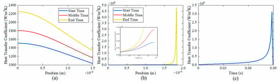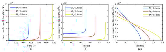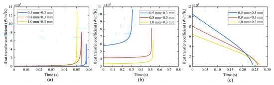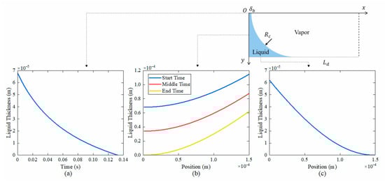 The liquid film thickness decreases from the initial liquid film thickness due to evaporation, bubble acceleration shear force, and transversal flow until the microchannel wall dries out. Combined the initial liquid film thickness in circular and square microchannels [37,38,39], the initial film thickness of the long-side wall can be expressed as