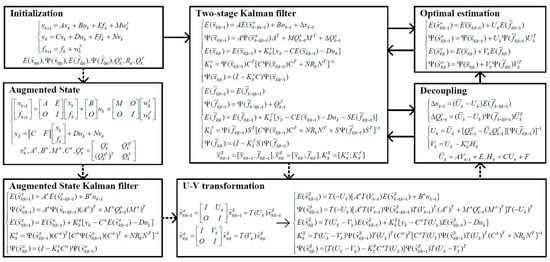 where . By adding the compensation of the unknown fault on the state , which is a random vector, the optimal sub-filter of state is expressed in Equation (34).