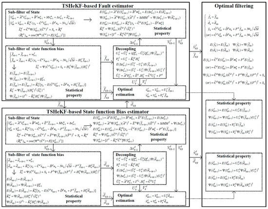 Considering the multi-source uncertain environment, the basic filter of the TSKF needs to be replaced by HeKF proposed in Section 3.2. Meanwhile, in this section, the optimal fault estimation for one type or batch of aeroengines is proposed based on Equation (3). Same as the TSKF, the TSHeKF is designed in the same four-step process which shown in Figure 1.