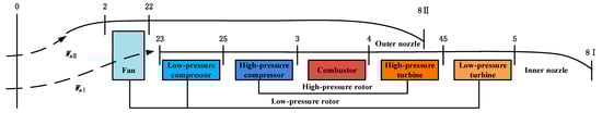 The structure and the section definition of the biaxial separated exhaust turbofan engine, which is taken as an example, is shown in Figure 4. The nonlinear and uncertainty modeling processes are shown in [3,35], and the linearization processes are clearly described in [36]. The rotational speed of low-pressure rotor and high-pressure rotor together form the state of the linear system. Meanwhile, the control variables of the system are composed of fuel flow , variable stator vane (), and variable bleed valve (). In contrast, the actuator fault modes discussed in this paper correspond to the control variables. Concurrently, the output involves and , the total pressure on the outlet of the low-pressure compressor and high-pressure compressor , and the total temperature on the outlet of the high-pressure compressor , high-pressure turbine , and low-pressure turbine . Considering the ground state (H = 0 km, Ma = 0), with the working condition of (Percentage of ), the parameter of the above control and output variables are shown in Table 1 and Table 2. To facilitate the evaluation of the performance of actuator fault estimation, the fault drive matrices are normalized in this paper, as shown in Table 3. As for uncertainty modeling of state-space system, this paper follows [6], which assumes that the probabilistic system parameters obey Gaussian distribution, and the statistical property of control matrices of the state-space system for each element is shown in Table 4.