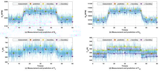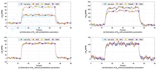 In this section, the performances of the TSKF, TSHeKF, and HFO are compared under fault-free conditions, and numerical simulation is carried out under multi-source uncertainty, as shown in Table 1, Table 2, Table 3 and Table 4. The simulation process is given as follows. The simulation duration is with a sampling time of , and a step of fuel flow is given from to . The comparative results of the TSKF, TSHeKF, and HFO-based state estimation, with and without accounting for probabilistic system parameters, are shown in Figure 5. The HFO-based optimal output prediction and estimation of state function bias are shown in Figure 6 and Figure 7, respectively.