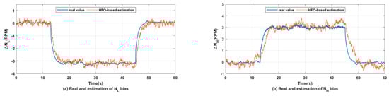As can be seen from Figure 5, when the model uncertainty is not considered, all of the three filters can realize precise state estimation. However, when considering systems with probabilistic parameters, neither the TSKF nor the TSHeKF can achieve accurate tracking of states. Due to the additional estimation of state function bias in Figure 7, only the HFO enables optimal state estimation under multi-source uncertainty. As it is well known that the probability of a Gaussian random variable takes value in the range of and is approximately equivalent to , it is referred to in this paper as σ-percentage for simplicity of description. Where both the states and outputs follow the Gaussian distribution, and also considering the mutually independence between different outputs, the for outputs at time are the corresponding diagonal elements of . For the output prediction in Figure 6, the σ-percentage for the shown outputs are , , , and . It is clear that the HFO-based predictions of σ-percentage of the outputs are basically equal to the theoretical value, which further illustrates that the HFO-based state estimation is optimal. As for Figure 7, since increment of state and input is around zero while the aeroengine is at the steady-state point, state function bias is only valued when system deviates from the steady-state. It is clear that after the step of fuel flow, gradually stabilizes to another steady-state, and the HFO realized accurate tracking of unknown input lays the foundation for optimal filtering under multi-source uncertainty.