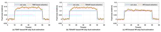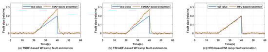 In this section, the accuracies of fault estimation based on the TSKF, TSHeKF, and HFO are evaluated firstly by keeping the control process of numerical simulation in Section 5.2 unchanged and adding fault inputs. Numerical simulations of step fault and ramp fault of fuel flow are used for verification, and the estimation results of different method are shown in Figure 8 and Figure 9, respectively. The step fault is of and remains between and ; meanwhile, the ramp fault starts from and maintains at , with a slope of .