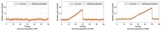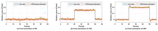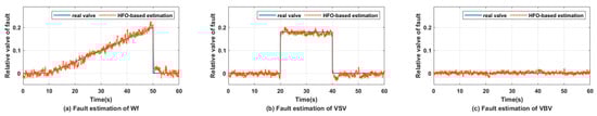 Next, the effectiveness of HFO-based multi-fault estimation is demonstrated in Figure 10, Figure 11, Figure 12, Figure 13 and Figure 14. Each figure corresponds to a specific multi-actuator fault mode. The multi-fault modes are set by considering the components, type, sequence of occurrence, and duration of the fault, and following five fault mode were established for simulation verification.