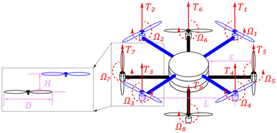 As shown in Figure 1, the rotor system of an overlapping octocopter is divided into two layers. Four upper rotors and four lower rotors are located around the center of the vehicle. The angle between the upper rotor arm and lower rotor arm is 45°. is the rotor speed RPM. is the distance between the rotation centers of the adjacent rotors on the same level. is the diameter of the rotor. represents the thrust of the -th rotor. is the length of the rotor arm. is the distance between the upper rotor and the lower rotor, which is fixed as 0.75 D [18]. Two sets of rotor motors on the diagonal run in the same direction, providing the required thrust and torque for the overlapping octocopter.