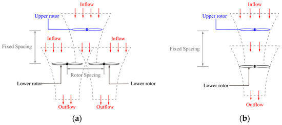 Figure 2 shows the flow field of the novel overlapping rotors with two layers compared with traditional co-axial rotors. Considering that there are two layers, the upper rotor will change the original wake of the lower rotor completely, especially when the downwash of the upper rotor interacts with the inflow of the lower rotor. In this case, the increased downwash posed on the lower rotor will definitely change the whole efficiency for a given spacing. Moreover, if the lower rotor operates entirely within the outflow of the upper rotor like the co-axial rotors shown in Figure 2b, it may induce vibrations with extra power consumption and eventually decrease the stability and flight performance of the MAV. Although the rotor interference between two layers is not as strong as the co-axial rotors, the interference from the adjacent rotors will make the aerodynamic environment much more complicated [19].