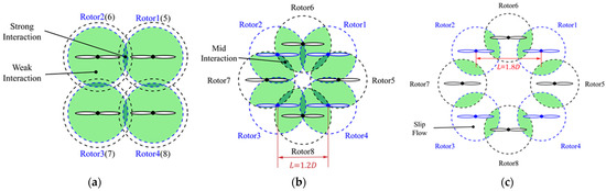 Interaction area. (a) Co-axial octocopter; (b) Overlapping octocopter at 1.2; (c) Overlapping octocopter at 1.8.