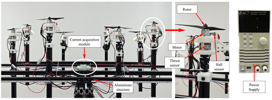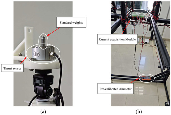 Thrust sensors and the current acquisition module were calibrated using standard weights and a precalibrated ammeter, respectively, as shown in Figure 6.