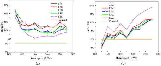 Thrust and power variation of the overlapping octocopter compared with the co-axial octocopter: (a) Thrust variation; (b) power variation.