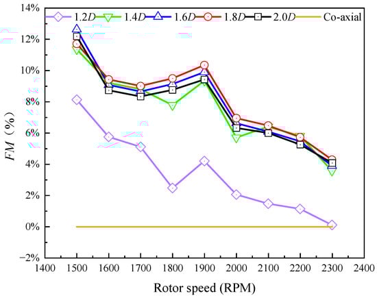Figure 8 shows the FM variation of the overlapping octocopter compared with the co-axial octocopter. FM (%) is the FM increment of the overlapping octocopter compared with the co-axial octocopter in the same condition. Clearly, the FM of the overlapping octocopter is higher than that of the co-axial octocopter and it is up to 10% at 1800 RPM. In this case, the proper interference is leading to increasing thrust. Furthermore, = 1.2 presented a lower FM and shared a similar FM for a higher rotor speed. Considering that the vortex movement in the outflow is much faster at a higher rotor speed than 2200 RPM, it accelerates the deformation of the vortex. From this aspect, the overlapping octocopter may not be suitable for a hover flight with higher rotor speed.