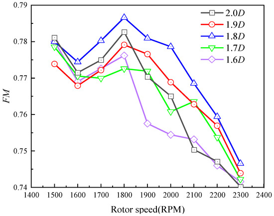 To show the optimal rotor spacing for the overlapping arrangement, the FM distribution is shown in Figure 9. It is noted that the rotor spacing = 1.8 obtained a higher FM for all the rotor speeds and it reached the maximum at 1800 RPM. This trend indicated that the overlapping octocopter obtained the best hover efficiency with a rotor speed around 1800 RPM at 1.8. Thus, the flow distribution considering the rotor interference with the optimal rotor spacing of 1.8 at 1800 RPM needs verification from numerical simulations.