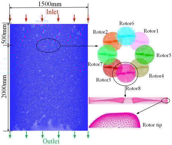 Numerical simulations are performed with ANSYS FLUENT (2021R1) and the rotor speed ranges from 1500 to 2300 RPM. The computational domain is divided into eight rotating regions and one stationary region. The octocopter is located in the upper part of the domain to obtain more detail of the downwash flow. Additionally, sliding mesh is applied to perform unsteady analysis with multiple viscous boundary layers to refine the mesh and reach the independence state. The first boundary layer thickness of the mesh is m, with an average wall value of 4.79. Finally, there are 29 million meshes with the max element skewness of 0.8. The mesh distribution and boundary conditions are shown in Figure 10.