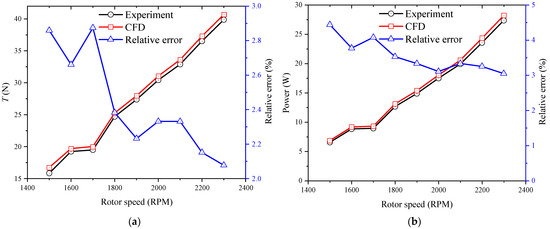 Validation of numerical simulations (). (a) Thrust; (b) Power.