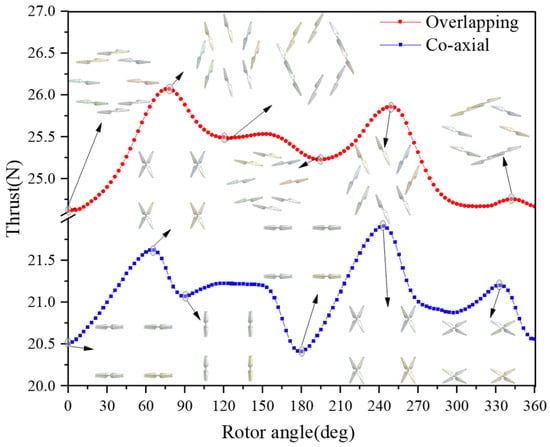 Figure 12 shows the thrust variation of the overlapping octocopter and co-axial octocopter within one rotation cycle.