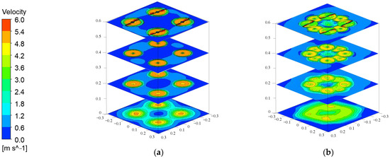 To present the flow field affected by both the upper rotor and adjacent rotor, the velocity distribution of the downwash flow is crucial for the aerodynamic improvement to characterize the rotor interference. Figure 13 shows the velocity distribution of the downwash flow for both the co-axial octocopter and overlapping octocopter.