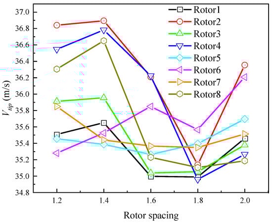 As shown in the Figure 14, the maximal velocity difference is observed at = 1.2 where rotor 2 and rotor 6 suffered thrust decrement affected by the rotor interference. Additionally, the velocity is evenly distributed for all eight rotors at = 1.8 which indicated the potential stability of this rotor spacing.