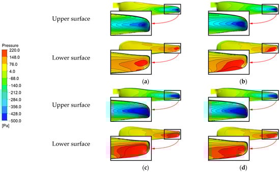 Pressure distribution on the lower rotor (rotor 1). (a) Co-axial octocopter; (b) Overlapping octocopter with = 1.6 ; (c) Overlapping octocopter with = 1.8 ; (d) Overlapping octocopter with = 2.0 .