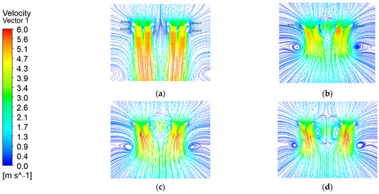 Streamline distribution. (a) Co-axial octocopter; (b) Overlapping octocopter with = 1.6 ; (c) Overlapping octocopter with = 1.8 ; (d) Overlapping octocopter with = 2.0 .
