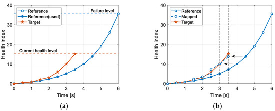 Developed by the authors, Data augmentation prognostics (DAPROG) is an RUL estimation algorithm that utilizes Dynamic Time Warping (DTW) to create virtual RTF data from existing RTF datasets [27]. DTW is an algorithm for aligning two time-series data in a way that minimizes the total cost defined by the DTW distance [26]. An example in Figure 2a shows two health index data series, with the blue circles and red asterisks representing the reference (training) and target (test) data with their sequence point number, respectively. Figure 2b displays the accumulated cost matrix, constructed by summing the distances for all possible paired paths between the two series. Each matrix entry at (i, j) represents the cost to align the i-th point of the target series with the j-th point of the reference series, plus the minimum cost from the following neighboring cells: (i – 1, j), (i, j – 1), and (i – 1, j – 1). The optimal warping path, which minimizes the total cost by accommodating the alignment of the sequences through stretching and compressing, is then determined to ensure the best alignment between the reference and target data.