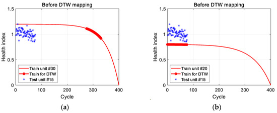 Then, the location of the test data and the corresponding DTW coverage (thick portion of the curve) become those in Figure 14a, from which the warping path and virtual RTF curves are given by (b) and (c), respectively. In Figure 14c, the RULs are estimated as the distance between the EOL and the end cycle of the test data.