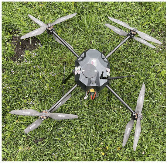 In this paper, we focus on diagnostics of the octocopter Figure 1. Due to its design and motor arrangement, this type of drone can withstand more demanding environmental conditions. In case of the loss of even three propellers, it can continue its mission []. In the unmanned multirotor, a flight controller was used, which has a triple-redundant system and, in case of failure of one of the inertial navigation systems, can still complete the mission. The components used in the drone are presented in Table 1.