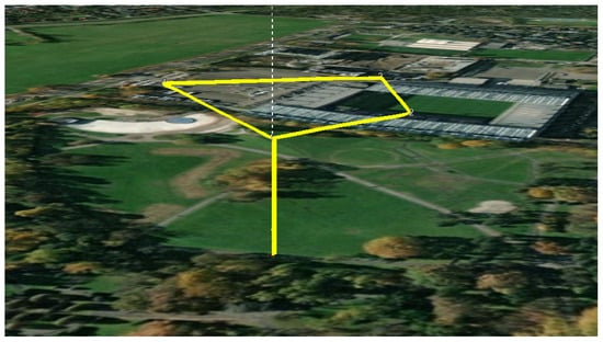 To collect high-quality data that can be easily compared, researchers conducted a series of automated flights. Utilizing the capabilities of the open-source autopilot “Ardupilot” [], they logged data from the start of the mission to its end every 10 ms. This method allowed them to read and analyze the data from the MicroSD card. They carried out each automated flight on a pre-programmed route, which standardized the test conditions shown in Figure 2.
