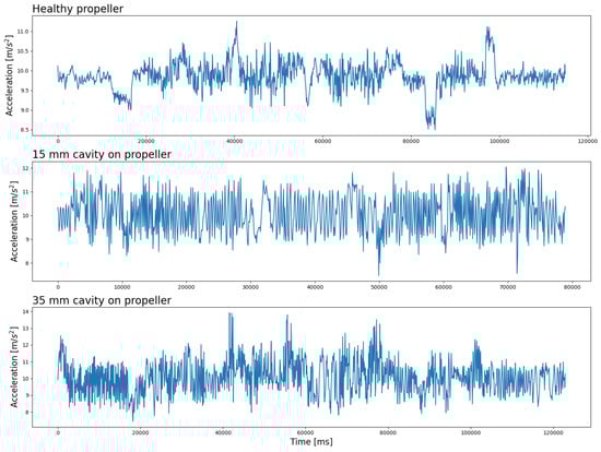Monitoring damage using micro-electromechanical accelerometers placed next to each of the drone’s motors also shows potential. Based on the collected vibrations in the time domain, Fourier Transform is performed, which is the base for the propeller damage detection analysis. However, the conclusion is that using this method in real-time during the flight of a UAV is difficult due to the interference of motor vibrations, which transfer to other motors [].