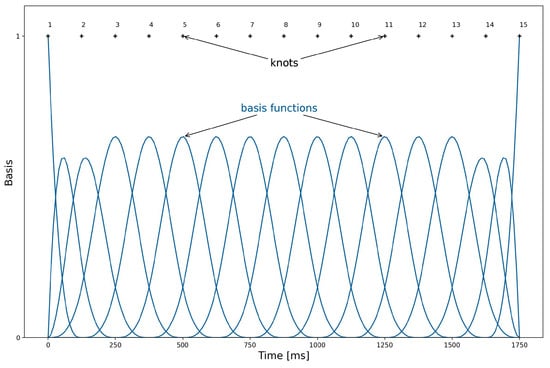 Parameters are not known and are obtained through inference, making the proposed model a hierarchical one. Relations of the entire model are presented using Bayesian network plate notation in Figure 5. In order to ensure we chose the right amount of splines, we conducted experiments consisting of calculating the Watanabe–Akaike information criterion (WAIC), and cross referencing the obtained values with statistics of 10 classification runs from the model. Lower WAIC values were obtained as more splines were used, while model performance slightly declined, which was interpreted as a warning of excessive model complexity. Therefore, the number of splines should be chosen in such a way that the model is sufficiently informative but not overfitted. As a result, 15 splines were chosen for the binary classifier and 20 for the three-class classifier. The basis for the binary classifier is shown in Figure 6.