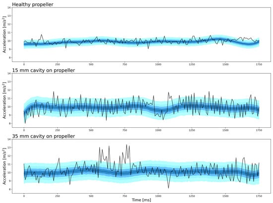 Additionally, experiments were conducted with a three-class classifier, which aimed to predict the condition of the drone’s propellers. This classifier was able to determine whether the propellers were fully functional, if one had a 15 mm damaged area, or a 35 mm damaged area, thereby achieving an accuracy of . These results demonstrate that it is possible to accurately monitor the technical condition of propellers using advanced classification methods. This model suffers from uncertainties when it tries to distinguish the type of damage. When its diagnosis still could be used as a warning, we aim to improve its precision. While current trials focus on increasing the number of splines used to represent the class or attempts to adjust priors were futile, we believe that incorporating data fusion methods will yield satisfactory results. Other types of experiments included changing samples from single vector containing a Euclidean norm to matrix containing data from each axis; however, results were similar at best. From our observation, the root of this problem is that, during certain movements, vibrations caused by the damaged propeller are greater along certain axes while being very similar across the remaining ones at the same timestamp. This confuses the model so that, on average, it performs worse. However, this topic has not been fully explored and we plan to test this approach further.