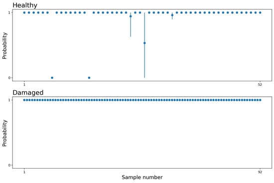 In the figure, we can see an example of classification. Each plot shows the probability distribution of each sample belonging to its respective class. The blue dot represents the mean values, when the blue bar presents 95% confidence interval, the mean value equal or above 0.5 is considered as a success. The model has high confidence in its predictions with two wrong classifications in the healthy class and a perfect result in the damaged class.