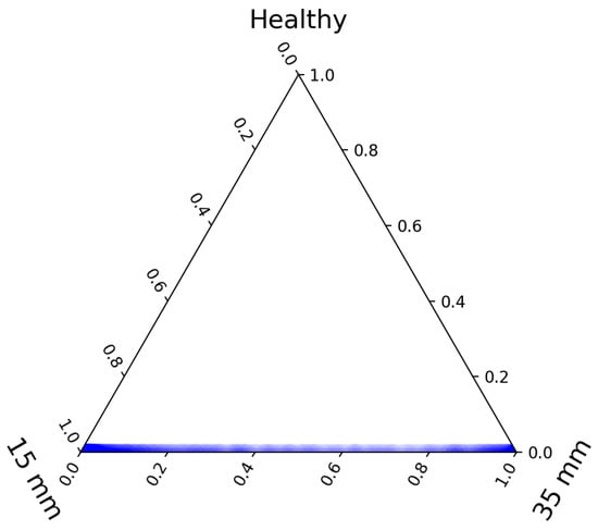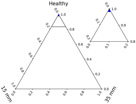 In the figure, we can see an example of incorrect classification using three-class classifier presented on ternary plot. Each corner represents the probability of belonging to a different class. All the samples are scattered between the 15 mm and 35 mm damage class. The model predicted the 15 mm cavity, which can be seen with a higher concentration in the respective corner, while the correct class was the 35 mm cavity.